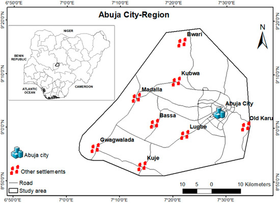 This study focuses on Abuja, one of the fastest growing cities in Sub-Saharan Africa [30]. As shown in Figure 1, the study area is a part of the Nigerian Federal Capital Territory (FCT) and comprises the Federal Capital City (FCC) and other surrounding settlements. The total area of the study area is approximately 1994 km2. It covers the major parts of two local government areas of FCT, which include Abuja Municipal and Bwari Local Government Areas. It extends into Gwagwalada and Kuje Local Government Areas of FCT in the southern part of the city-region [25].