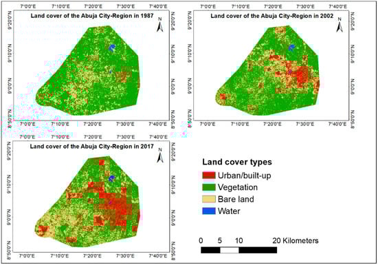 Land cover of Abuja city-region in 1987, 2002, and 2017.