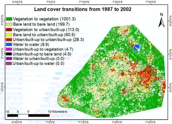 Abuja land cover transition from 1987 to 2002, with transitioned land area shown in parentheses in km2.