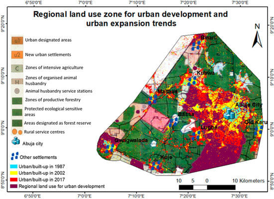 - Ujoh, F.; Kwabe, I.D.; Ifatimehin, O.O. Understanding urban sprawl in the Federal Capital City, Abuja: Towards sustainable urbanization in Nigeria. J. Geogr. Reg. Plann. 2010, 3, 106–113. Available online: https://academicjournals.org/journal/JGRP/article-abstract/5DEAA5539644 (accessed on 6 January 2018).