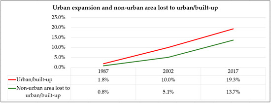 Past and current urban developments are mostly concentrated in Abuja city, with more space for urban development found in the southern part of the city. However, urban land uses are also expanding into areas designated for non-urban development (Figure 10). Our results in Table 5 indicate that the total area of non-urban development in the city-region is approximately 555.25 km2. Urban/built-up gradually expanded into the non-urban development areas, which lost 11.65 km2 (0.8%), 73.58 km2 (5.1%), and 179.57 km2 (13.7%) to urban/built-up in 1987, 2002, and 2017, respectively (Table 5 and Figure 11). From 1987 to 2002 and from 2002 to 2017, the ACR of non-urban development areas was 4.13 km2 and 7.07 km2 per year, which converted to urban/built-up land uses, respectively.