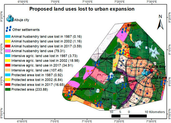 Our results highlight large mismatches between the regional land use plan and the observed urban land cover, indicating an uncontrolled and rapid urban expansion. This result indicates gaps between planned land use developments and actual urban expansion, similar to those observed by Shen et al. [53] for urban expansion in China, who underscored that urban expansion occurred often in an uncontrolled manner and in conflict to proposed and existing land use plans, impeding efforts for a more sustainable urban expansion. Our study showed that the area designated for urban development was larger than the total area of the past and current urban land cover (Figure 10 and Table 5). The urban expansion might have been more sustainable if it were steered towards the areas proposed for urban development. Figure 8 showed that the regional land use plan proposed Lugbe as one of the areas for productive forestry and forest reserve. However, as indicated in Figure 12, urban expansion did not stop at the proposed borders of urban development areas. Between 2002 and 2017, urban areas expanded continuously into Lugbe. In the city-region, various land uses designated for nature conservation, intensive agriculture, animal husbandry that were lost to urban/built-up have increased in recent decades (Figure 12 and Figure 13). Built-up land coverage in 1987 was relatively low at 1.8% (Table 3) when the region primarily comprised of a few, isolated settlements. A large expansion of urban/built-up area could be identified until 2002 (10%), which increased to 19.3% in 2017 (Figure 4 and Table 3). The transition mapping results indicated rapid urban expansion at the expense of vegetation cover. This result differs from those of Mahmoud et al. [25], who reported rapid urban expansion at the expense of bare land in Abuja. However, the results coincide with several previous studies such as Akpu et al. [7], Owoeye and Ibitoye [8], and Fanan, Isa, and Olarewaju [11], who observed urban expansion at the expense of vegetation cover in their various study areas. The reduction of vegetation cover as indicated by our results also corresponds with similar studies, such as Mahmoud et al. [25], Owoeye and Ibitoye [8], and Barrera and Henríquez [12], and Hassan [54], all of which highlight a large loss of vegetated area due to urban expansion in developing regions. Parallel to the expansion of urban areas, we also observed an increase in bare lands, adding to an even more rapid reduction of vegetation within the region. Despite the high degree at which bare land was converted into urban/built-up between 2002 and 2017 (Figure 6), our result showed an increase of bare land (Table 3), similar to Fanan, Isa, and Olarewaju [11]. This result contradicts that of Mahmoud et al. [25], who reported a decrease in bare land in Abuja. In other African cities, decreases in bare land during periods of urban expansion have been observed by Hou, Estoque, and Murayama [28]. Our observed increase in bare land may be due to rapid increases in food and wood demands, in turn driving agricultural expansion and deforestation. Further field observation and interviews with locals will enable us to explore this question directly in subsequent research.