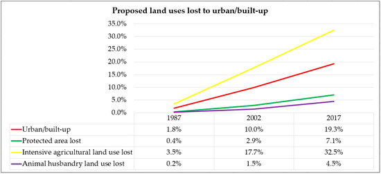 Percentage of proposed land uses lost to urban/built-up and urban expansion trends.