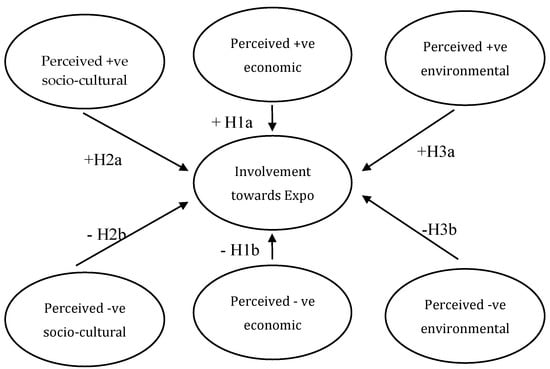 The design of this study thus, is firmly grounded in the appropriate theoretical framework. It is quite evident from the literature available in public domain that stakeholders do carry perceptions about events and take an active interest in the resultant impacts leading the current study to analyze and evaluate the triple bottom line of economic, social and environmental perceived implications. Subsequently, several indicators and sub-indicators have been identified in order to measure the stakeholders’ participation, which has been discussed in the previous studies, such as the perceived impacts of tourism development [42]; stakeholder knowledge [8]; support for tourism development [43]; community attitudes toward tourism development [44]. The hypothetical framework is an adaptation from [45] in which five latent constructs of tourism development and community satisfaction were considered. The proposed framework however, is a pre-event evaluation thus replacing the satisfaction construct with involvement and participation in the event based on the residents’ perception of impacts. Each path in the framework (Figure 1) represents a hypothesized relationship with the direction of effect identified as either positive (+) or negative (−).