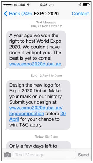 Path hypothesis H2a: “Positive Social Perception of Expo 2020 positively impacts involvement of residents towards Expo 2020” was supported (+0.681), though mixed results were received when the questions related to socio-cultural issues were asked to the respondents. Nearly 52 percent of the respondents agreed to the fact that the event would strengthen the destination image, followed by 50 percent who believed in the development of recreational facilities which could be used by them once the event concludes (Table 3). Almost one third of the respondents were concerned about the inconvenience to the general public caused due to the event. Less than one fourth of the respondents showed their concern about an increase in anti-social elements due to the event, which demonstrates their confidence in law and order maintained in the country for a long time. Only 8 percent of the respondents said that the event would negatively affect their traditions and culture, which might be a reflection of a huge multi-national community living in the country. Although only 9 percent of the respondents believed in the fact that the event will lead to a preference given to the visitors over residents, half of the respondents agreed on event bringing positive socio-cultural impacts on the community. Interestingly, 48 percent of the respondents possessed a feeling of pride for being part of the country organizing the mega event. The organizers have been quite strong in media and publicity and have been continuously sending text messages (Figure 3) to the residents, however there remains scope for further improvement in their level of involvement. For instance, residents could be invited to volunteer in the event as has been the practice for the previous world expos. Nearly one fourth of the respondents knew details about the event and 47 percent said that they received news/updates about the event, through text messages/emails. While 53 percent of the respondents said they would like to promote the event, a sizable number of respondents (64 percent) showed their inclination towards participating in the event through volunteer activities.