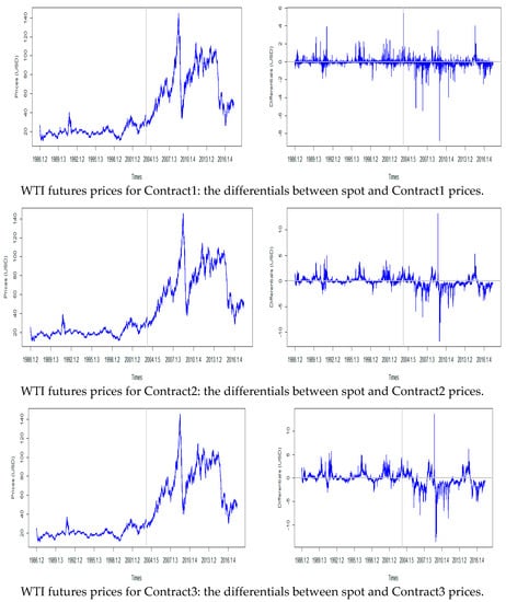 Figure 1 shows the WTI crude oil price trends from 2 January 1986 to 26 May 2017. After March 2003, when the Iraq War broke out, the average level and volatility of crude oil prices showed an accelerated rise. After the war, there are more occasional spikes in crude prices. Therefore, this study segmented the sample into two sampled periods: Prewar, which spans 2 January 1986 to 20 March 2003, and Postwar, which spans 21 March 2003 to 26 May 2017. Figure 2 displays the crude oil futures prices, as well as the differentials between the crude spot and futures prices. Although the overall price trends of the crude oil spot and four futures prices are similar, the differential is more significant in longer maturity pairs than in shorter maturity pairs.