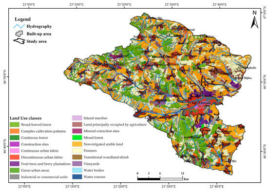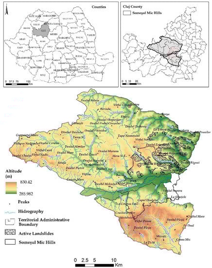 The study area is represented by the hills surrounding Cluj-Napoca metropolitan area, located in the county of Cluj, in the eastern sector of the Depression of Transylvania, Romania (Figure 1) with an area of 1041 km2. The altitude difference of the analysed region is 545 m, varying between 285 m, specific to the lower section of the Somes River bed and 830 m specific to the high hills. The elevated character of the analysed area is highlighted both from the point of view of the specific altitudes and of the slopes having an average value of 7.8° with a maximum of 45.3° which implies a high and dynamic potential. The diverse geology of the region includes marls, sands, gravel, clay, gypsum and sandstone, muddy clays, bituminous marls etc., which due to the increased fragmentation of the secondary hydrographic network, lead to the existence of 29 sloping areas of active land. This database of land-based landslides and recent satellite imagery is the basis for the implementation of the model for determining the likelihood of landslides, so it is necessary to produce a complete and current database [,].