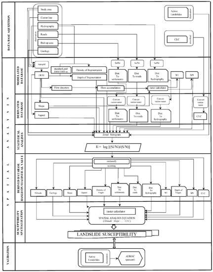 From a methodological point of view (Figure 2), the spatial analysis GIS model for the identification of susceptibility to landslides is structured over three main interconnected phases: the acquisition of the databases, the spatial analysis phase structured on five main subparts, starting from the modelling intermediate databases by dividing intermediate databases for which statistical susceptibility values are calculated, values to be taken into account in the stage of spatial susceptibility analysis, ending with the main validation stage of the model results. The correct realization and efficient single factor analysis make the final result as a spatial database able to be used successfully within other complex spatial analysis models [,].