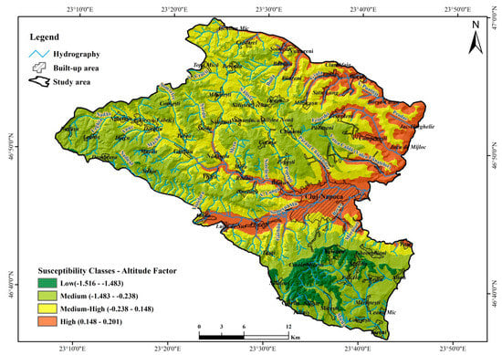 The analysis of the altitude factor as an individual database regarding susceptibility to landslides is made by reclassifying it into four major impact categories: low susceptibility (between −1.516 and −1.483 BSA value), medium susceptibility (between −1.483 and −0.238 BSA value), medium-high susceptibility (between −0.238 and 0.148 BSA value) and high susceptibility (between 0.148 and 0.201 BSA value) (Figure 3).