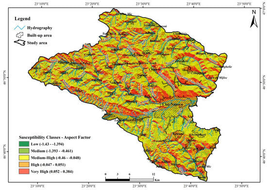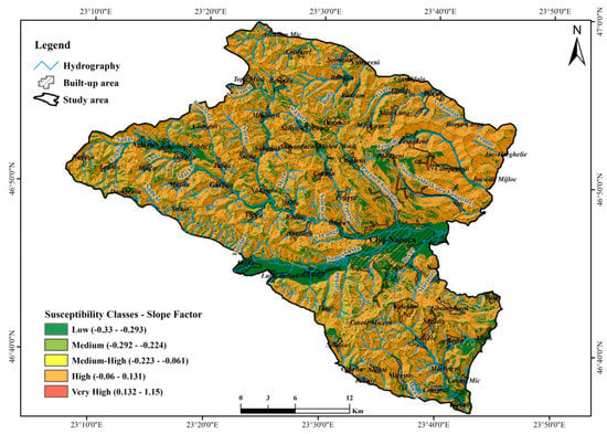 As observed by the analysis of the altitude factor, the area of study is represented by a predominantly hilly territory with an average relief energy which induces the classification for the largest part of the territory in the average susceptibility class (−0.329 to 0.124 BSA statistical value), the high values being isolated in the high hill area and in contact with the adjacent mountain (Figure 15).