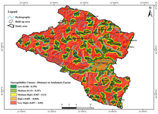 Susceptibility to landslides according to distance to settlements.