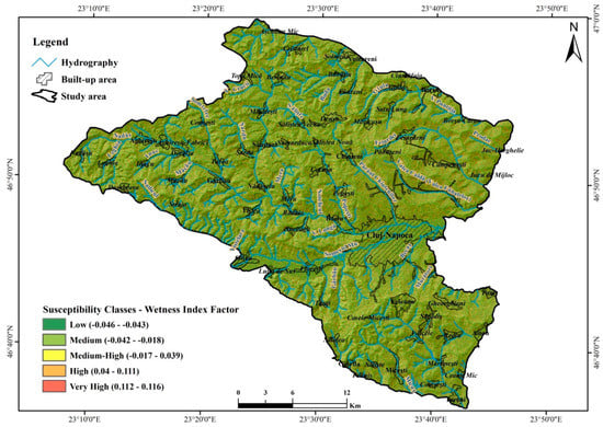 Wetness index values are within the range −0.046 to 0.116 to highlight areas with high relative saturation in water, thus directly affecting the cause of the landslide triggering as well as the reactivation moments of them, therefore characterizing the analysed territory in the high probability class []. This influence is also highlighted by the corresponding high statistical value of 0.110, resulting from the application of the BSA method (Table 8). On the opposite side, we identify areas characterized by very low wetness index values (ranging from 0–7) to which a low and medium susceptibility is specified (with a statistical value between −0.046 and −0.018) (Figure 9).
