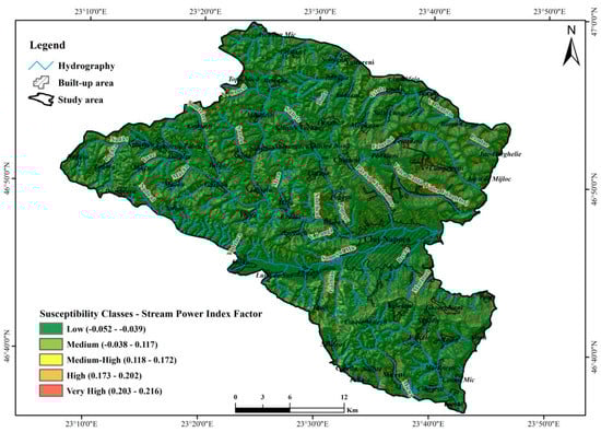 The Stream Power Index factor with calculated values ranging from −0.052 to 0.214 highlights the areas with accelerated water erosion potential, the positive values of this indicator corresponding to the lands with a high probability of landslides occurring at the level of the entire Transylvanian Plateau [,]. In the case of the studied area the values higher than 1.4 have the highest statistical representativeness (0.214) (Table 9). With this factor, the negative effect of the hydrographic erosion by the secondary hydrographic network is again highlighted, thus becoming an important factor in the assessment of the susceptibility to the landslides in the Somesul Mic hills (Figure 10).