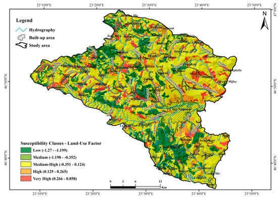 The vast majority of the analysed area is in the small susceptibility class, between −0.097 to −0.090 statistical calculated values, due to the disposition of the intravilanes at great distances from each other, the very high susceptibility class being identified in a very small proportion, only in some areas in the immediate vicinity of large settlements and cities (Figure 6).