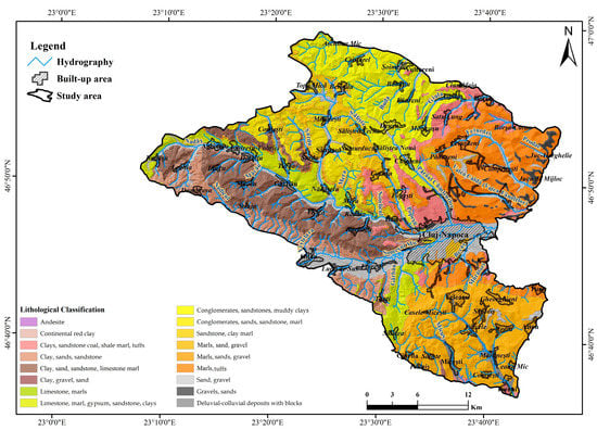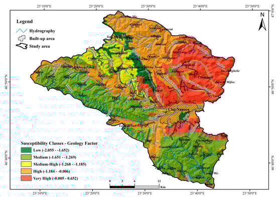 At the spatial level, the south-eastern extension of the analysed territory, which falls within the high and very high susceptibility class (approximately 56%), with a major impact on the human component of activity (mainly industrial and production activities) on the outskirts of Cluj-Napoca, as well as on the newly developed residential areas in favour of pastures and orchards. An important area of the total surface analysed (32.29%) is classified as medium and low susceptibility class (approximately 38%), which is spatially identified on the entire western side of the territory. This is explained by the geology, respectively lithology specific to the hill-mountain contact areas of the Apuseni Mountains (Figure 13 and Figure 14).