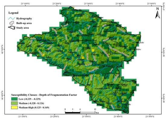 The depth of fragmentation expressed in m/km2 provides additional information regarding the energy available to trigger landslides, so territories with higher values of fragmentation depths above 200 m/km2 are characterized by the highest values of the BSA statistical indicator (0.16) and those that are less than 100 m/km2 have the lowest influence on the probability of landslides (Table 12).