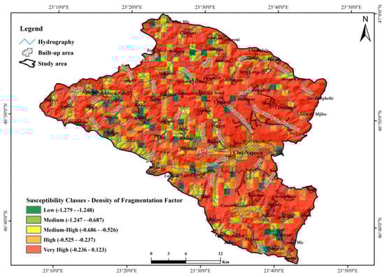 Density fragmentation (expressed in km/km2) highlights territories with a high density of the hydrographic network, density increasing the probability of landslides due to erosion, the appearance and dynamics of landslides. For the analysed territory, the highest density of landslides was identified for the range 0–1 km/km2, which is also reflected on the values calculated based on the BSA equation (Table 13). Regarding the spatial expansion of the susceptibility classes, the very high class stands out, with about 67% of the total territory overlapping mostly with low fragmentation areas (Figure 16).