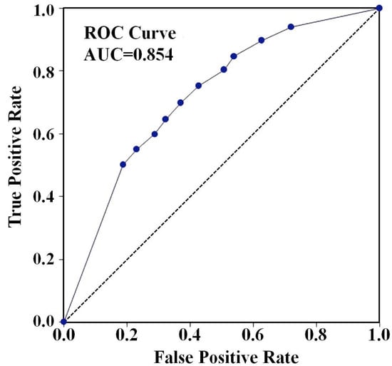 In order to identify the degree of predictability of the BSA model applied for the identification of the probability classes of landslides in the studied area, the AUROC (Area under the Receiver Operating Characteristic) curve method was used (Figure 18). The validation value of 0.854 indicates the relationship between true positive values (model sensitivity) and true negative values (model specificity) resulting in a large validation of the result, as it is known that the closer AUROC value is to 1, the more it reflects the degree of validation of the chosen method as well as of the database used [,,,].