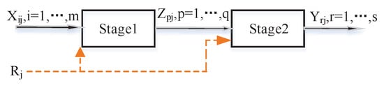 where and are the efficiency values of in the first stage and the second stage, respectively, and is the overall efficiency of the to be evaluated. It is noteworthy that the overall efficiency can be represented by a combination of and , namely . and represent the relative importance of Sub-stages 1 and 2, respectively. It can be measured by the proportion of inputs in each stage on the total inputs, that is,