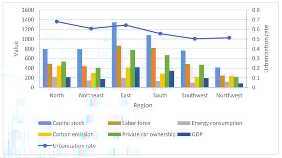 As shown in Figure 3, GDP was relatively large in the eastern and southern regions, while it varied little in the northern, northeastern, and southwestern regions, and it was smallest in the northwest. At the same time, other indicators such as labor force, private car ownership, and capital stock showed the same trend as GDP in each region. This phenomenon was caused by the relatively developed economy and technology in the east and south of China, while the relatively undeveloped situation in the northwest. Energy consumption and CO emission in the north and east were higher, but in the southwest and northwest, they were less since economic development in the north and northeast mainly depends on heavy industry and energy utilization. As for the southwest and northwest, such as Yunnan, Gansu, and Ningxia, there were less energy consumption and CO emissions because of the sparse population and tourism. The urbanization rate was higher in the north, northeast, and east, while it was lower in the south, southwest, and northwest, but they all exceeded 0.5. According to the analysis above, the efficiency evaluation of each province needs to take all the above indicators into account.