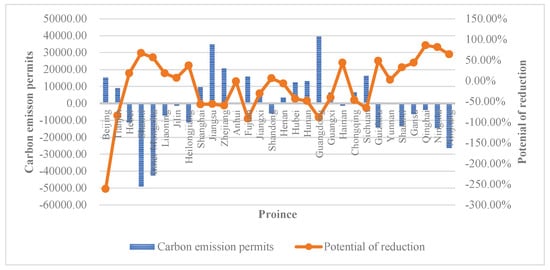 The last column in the Table 4 is the space of carbon emission that was attained based on the difference between the carbon allocation and actual emission of each province. The space of carbon emission reflects the maximum amount of CO that each province can emit. If the value is negative, this indicates that the corresponding province should improve energy efficiency and reduce CO emission. Otherwise, it demonstrates that the province has enough carbon emission right. The results of carbon emission permits of each province in 2016 are shown in Figure 4.