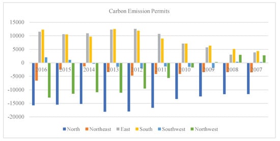 In Figure 5, the values of carbon emission permits in north and northeast China were negative from 2007–2016, and the phenomenon of excess emissions was most serious in 2011, 2012, and 2013. Although the situation has improved since 2014, it is still necessary to develop the production technology level and energy utilization to reduce CO emissions. As for the northwest, carbon emission permit values continued to be negative after 2010. In addition, the carbon emission permits of the southwest were almost zero, which indicates that there was almost no difference between the actual consumption and carbon emissions. The space of carbon emission in southern and eastern areas was not only large, but also gradually increasing because of the economy and technology.