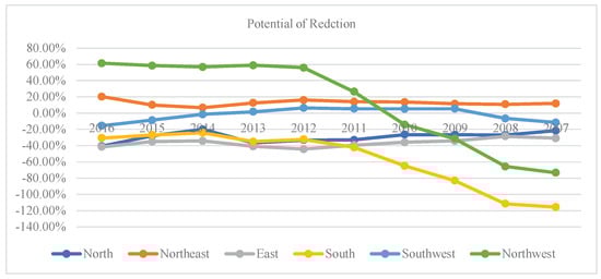 In Figure 6, the potential of carbon emission reduction in the north, northeast, southwest, and east was basically stable from 2007–2016. Furthermore, the carbon emission reduction potential of the northeast and southwest remained less, while that of northern and eastern China was below zero. The potential in regions such as the south and the northwest changed greatly, and the trend was basically the same. In addition, the potential of carbon emission reduction in the northwest increased significantly and gradually became stable after 2012.