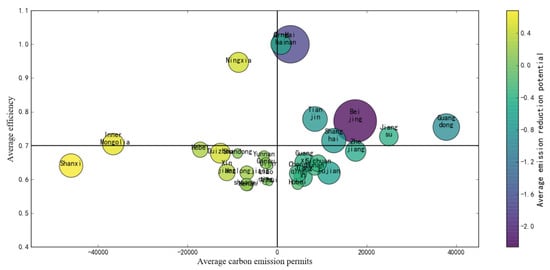 The abscissa of Figure 7 represents the average space of carbon emission of each province from 2007–2016; the ordinate represents the average efficiency value of each province; and the color bar on the right represents the average potential of emission reduction. If the value of average emission reduction potential is below zero, then the color is dark, and the potential of emission reduction is less. As can be seen from Figure 7, 30 provinces were divided into four categories according to the average efficiency value (i.e., 0.7) and the space of carbon emission (i.e., zero). The provinces with an efficiency value greater than 0.7 and carbon emission permits greater than zero included Qinghai, Hainan, Beijing, Tianjin, Guangdong, Shanghai, and Jiangsu. The provinces with an efficiency value greater than 0.7 and the carbon emission permit less than zero included Ningxia and Inner Mongolia. The provinces with an efficiency value less than 0.7 and carbon emission space less than zero involved Shanxi, Hebei, Guizhou, Shandong, Yunnan, Gansu, Jilin, Xinjiang, Heilongjiang, Henan., and Shaanxi, while provinces with an efficiency value less than 0.7 and carbon emission permit greater than 0 were Liaoning, Anhui, Chongqing, Jiangxi, Hubei, Guangxi, Sichuan, Hunan, Fujian, and Zhejiang. Shanxi, Inner Mongolia, Ningxia, Guizhou, and other provinces have great potential for emission reduction. In addition, coastal areas had high efficiency values and carbon emission permits, but the efficiency value of the eastern, central, and southern regions were low, while northern regions had high efficiency values.