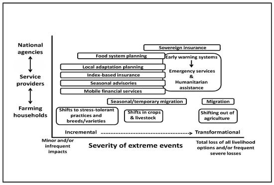 The actions required for adaptation to climate change within agriculture are wide-ranging. They span the continuum from incremental adaptation to transformative adaptation, where incremental adaptation is defined as actions where the central aim is to maintain the essence and integrity of a system or process at a given scale, whereas transformative adaptation involves changes in the fundamental attributes of a system in response to climate and its effects (pp. 15–58 [27]). It is important to mention that under some circumstances gradual changes and incremental steps can add up to a transformative change [40]. Both incremental and transformative adaptation can occur across scales from farm households to national agencies [41] (Figure 2). For example, with infrequent and/or minor climatic impacts, households can decide to change varieties and breeds, while with more frequent and/or more severe events they may need to shift to other crops or other livestock species. With even more extreme conditions, the only solution may be to transit out of agriculture, with migration being a valid, if sometimes risky, adaptation action. Examples of adaptation actions which span that continuum are shown in Figure 2. Equally important is to acknowledge the transition that has already taken place as people have shifted from agriculture to other sectors and the consequences that these transitions can have on adequate adaptation options.