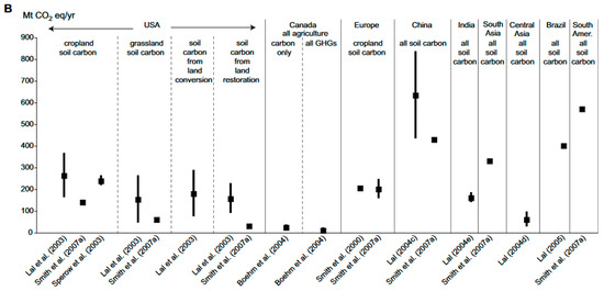 A similar story can be told with respect to mitigation options. Just to give an example, Table 2 highlights the differentiated mitigation opportunities when considering reducing emission through reduction of food loss and waste. It is even emphasized that for this particular matter, opportunities vary more by local context than region. Figure 4 taken from IPCC’s Fourth Report, presents an overview of the differences between countries and regions when considering mitigation options [158]. As can be observed for all soil carbon options, mitigation potential goes all the way from 900 Mt CO2 eq/yr in China to around 50 Mt CO2 eq/yr in Central Asia.
