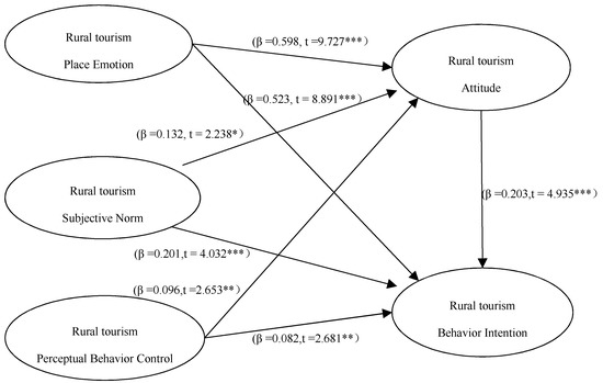 Reconstructing the relationship among space emotion, perceptual behavior control, and subjective norm with attitude can improve the explanation of the model. This also verifies the opinion that the subjective norm and attitude are not independent predictors, but rather are interrelated. When operating rural tourism activities, operators will be affected by the opinions of relatives and friends, which not only affect the attitude to their behavior towards engaging in tourism activities, but also indirectly promote a willingness to engage in rural tourism activities. This significantly enhances the explanation of tourists’ recreation behavior by remodeling the attitude relationship. Tourist behavioral intention is not only directly affected by positive behavioral attitude, although the subjective normative and perceptual behavioral controls are stronger; the tourist has a more positive attitude, and thus forms a positive intention to travel.