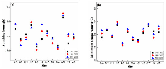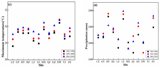 Sunshine hours, minimum temperature, maximum temperature, and precipitation of three time periods for each site, respectively: (a) sunshine hours; (b) minimum temperature; (c) maximum temperature; (d) precipitation. The black square, red circle, and blue triangle each represent the time periods 1981–1990,1991–2000, and 2001–2010, respectively.