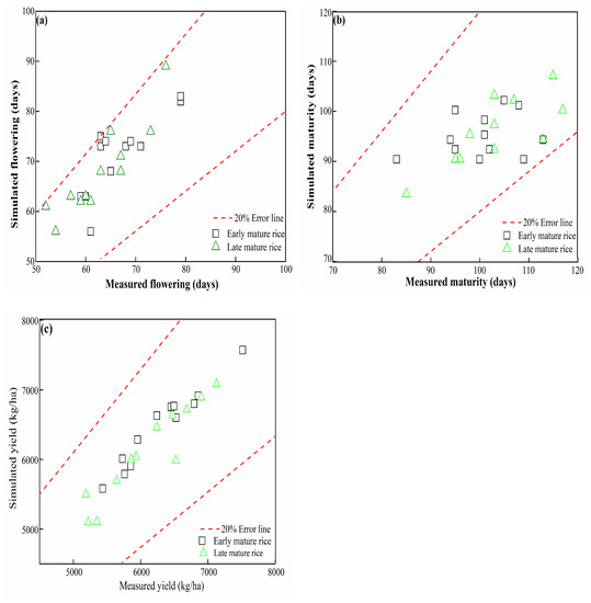 After rigorous calibration and validation, the detailed information of calibration and validation is shown in Figure 3. The calibrated and validated NRMSE between observed and simulated variables (flowering dates, maturity dates, and yields) are 12.28%, 13.13%, and 11.38% for early mature rice. Similarly, the NRMSEs are 18.05%, 16.63%, and 15.27% for late mature rice. For early mature rice, the NRMSEs are all less than 15%, which indicates a perfect model performance; for late mature rice, the NRMSEs all exceed 15% but are less than 20%, indicating a good model performance. Considering the various cultivars and agronomic management practices, the performance of the model is acceptable for simulating the yield potential. The detailed information of site location, cropping system, cultivar name, and cultivar parameters are each shown in Appendix B.