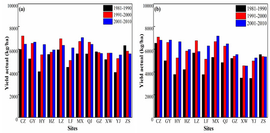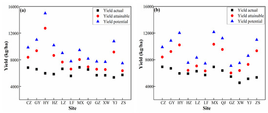 Yield attainable was less than the absolute biophysical ‘potential yields’, which represented the yield that is achievable using the current best-known technology and management techniques at a given time in a given ecosystem. The yield attainable was simulated using the same method for yield potential, except that the nutrients and water were provided abundantly. In other words, yield attainable also suffers from some nutrients and water stress for some time in the growing stages. Thus, the yield potential, yield attainable, and yield actual were all obtained, and the detailed information was shown in Figure 7a,b. In most of the sites, the yield actual has reached more than 50% of the yield potential, while the yield actual was less than the yield attainable, suggesting that rice yields were not near the yield potential, and that there is ample room for improvement. The average farm yields in a region or country are inevitably smaller than the yield potential, sometimes significantly so, because achieving yield potential requires near-perfect management of the crop and soil factors that influence plant growth and development throughout the crop growth cycle. In most irrigated major wheat, rice, and maize systems, yields appear to be at or near 80% of yield potential, with no evidence of yields having exceeded this threshold to date.