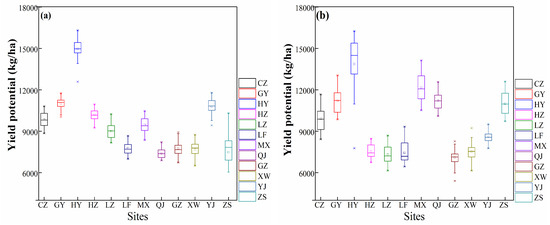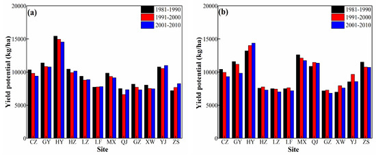 Simulated yield potentials of each site using weather data from 1981–2010: (a) for early mature rice; (b) for late mature rice.