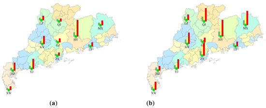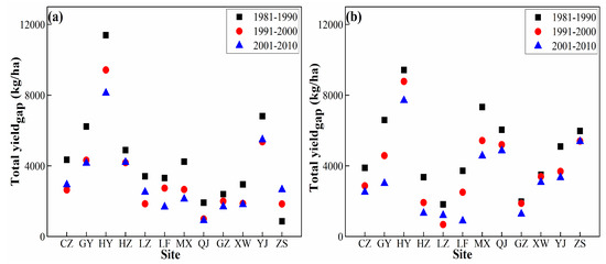 From Figure 6a,b, it can be observed that for most sites, the yield potential of early mature rice decreased during the three time periods except for site ZS, which had a small increase, and site LF, which had a yield stagnation. While for late mature rice, all of the sites were experiencing an obviously reducing trend. It can be concluded that for both early mature rice and late mature rice, the yield potential was decreasing constantly for most of the sites.