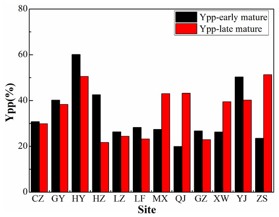 Yield gap percentage (Ypp) was obtained by Equation (7), and the results are shown in Figure 10. The higher the Ypp, the more potential ability the yield will have. The result clearly showed that the Ypp of the GY, HZ, and YJ sites for early mature rice and the HY, MX, and ZS sites for late mature rice all exceed 40%, implying a great potential ability for rice yield increase. Therefore, adaptive measures must be taken to raise the yield in these sites.