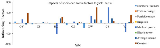 The yield actual was influenced by a variety of variables such as the number of farmers, usage of fertilizer and pesticide, application of irrigation, and machine power. These data were recorded by the Department of Statistics of local government through a standard procedure, and can be acquired from the statistics of Guangdong province, since these data were at the city level from 2001–2010, and some of the sites were not covered; the sites that have the corresponding economic variables were assessed and analyzed using the multiple linear regression method. These regressions were conducted on the same scale over the time period. The results are shown in Figure 11; it is evident that the number of people had a positive correlation with yield actual at the GY and CZ sites, while it had a negative correlation with yield actual at the other sites; fertilization had a positive correlation at all the sites; pesticide had a positive correlation in HZ, GZ, and XW, while it had a negative correlation at the remaining sites; machine power had a negative correlation at the HZ and YJ sites; electricity and irrigation have few impacts on the yields, so they can be neglected; average income is in a negative correlation in the GY and GZ sites. In all, with all these socio-economic variables considered, more usage of fertilization and machine power can increase the rice production. Irrigation has little impact, meaning that rice growing in this delta will not be influenced by irrigation, and also it can be concluded from Section 2.2.2 that the rainfall and water is abundant in this whole study area. The use of pesticide had a negative correlation at most of the sites, meaning that a great usage of pesticide will not benefit rice production, while in contrast, it will certainly reduce the yields. As for the average income of farmers, it had a positive correlation relationship at most of the sites, meaning that farmers would like to buy more fertilizer when they are able to. In all, the yield actual did not reach the ceiling of yield potential, so there is enough room to increase the yield of all the sites, and the common methods can be the greater adoption of organic fertilizers such as cattle manure, which will increase the organic components and improve the soil quality.