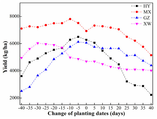 In order to obtain the most suitable planting dates, the planting dates were adjusted by advancing and delaying 40 days from the present date at intervals of five days; then, the simulated yields were compared with yields where the planting dates were held constant. We conducted the simulations at the HY, MX, GZ, and XW sites, where the yield potential had been predicted to decline dramatically in the future. Figure 12 showed the changing planting dates and the corresponding yield of four sites. The simulation results showed that changing the planting date could actually increase the yield to a certain degree. The maximum could be reached when the planting dates were advanced by five, 10, 10, and 20 days from the present planting dates for the HY, MX, GZ, and XW sites, respectively. For late mature rice, new genetic cultivars and new technologies are suggested to improve the rice yield.