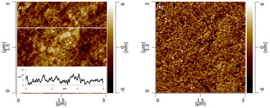 (a) AFM height image (3 μm × 3 μm) of a H-TOCN with topographic profile and (b) TOCN (3 μm × 3 μm) spincoated on an Au surface.