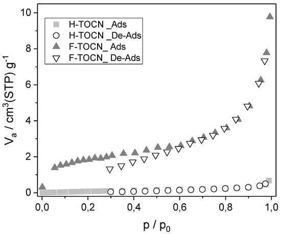Nitrogen adsorption-desorption isotherms at 77.35K of the investigated dried TOCNs (H-TOCN and F-TOCN) are presented in Figure 3., The shape of the isotherm displays an intermediate between types II and IV based on the IUPAC classification [30] which is indicative of an initial monomolecular adsorbate layer (i.e., type II assumption) followed by multi-layer adsorption. Moreover, as the isotherm features a slight hysteresis loop, usually generated by the capillary condensation of the adsorbate in the mesoporous structure, type IV behavior is also observed. Furthermore, BET analysis results also allow the total surface area (SBET (m2/g)) and pore radius of the samples to be determined. The SBET of the H-TOCN and F-TOCN samples are approximately 0.5 and 6.3 m2/g, whereas the average pore radius are of 1.21 and 1.85 nm, respectively.