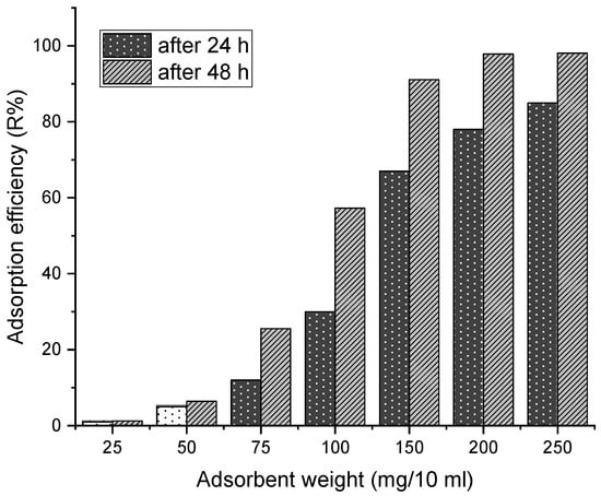 Adsorption efficiency of H-TOCNs for recovery of gold at different dose: doses = 25–250 mg/10 mL (C0 [Au] = 100 mg/L, C0 [Cl-]= 0.02 M, C0 [Cu+2]= 0.02 M after 24 h and 48 h, 130 rpm, pH = 2, 10 mL sol.).