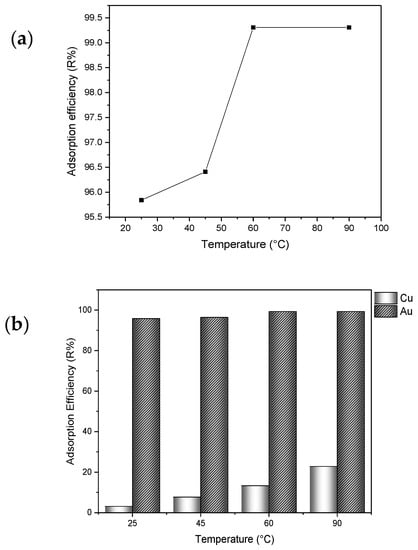 In the work outlined here, the simulated gold mining solution was varied between 10–100 mg/L at 0.02 M copper chloride solution and pH = 2 in order to investigate recovery of gold from a binary solution. In addition, the effect of temperature on gold recovery was studied over a temperature range between 25–90 °C at the same initial pH (2.0) and cupric chloride concentration (0.02 M) (Figure 5a). As can be observed from Figure 5a, the recovery of gold was enhanced up to 99% with increasing temperature. Most likely, the enhancement of gold recovery at higher temperature may be accounted for by the change in chemical morphology of the chloro-gold complexes with temperature [31].