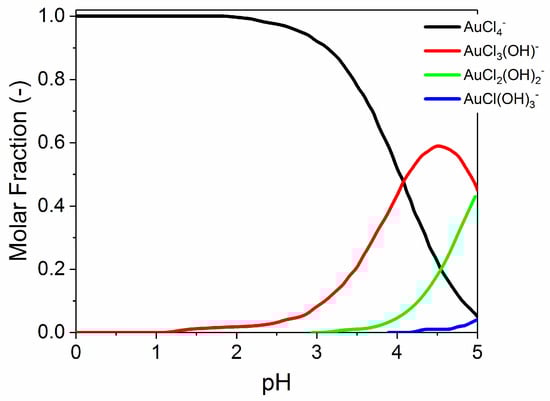 Another important factor that affects the adsorption behavior of gold is the chemical morphology of chloro-gold complexes. The ratio of each chloro-gold complex concentration relates to both chloride and hydrogen ion concentration, as well as temperature, as they can exist as different species depending on pH (Figure 6) [11].