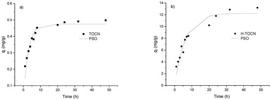 Adsorption kinetic data of gold onto the mentioned adsorbents (a) TOCN and (b) H-TOCN, experimental data are shown by symbols and the solid line the values predicted by the PSO model. (C0 [Au] = 100 mg/L, C0 [Cl-] = 0.02 M, 48 h, 130 rpm, pH = 2, 200 mL sol.).