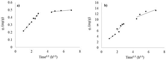 Additionally, the Weber–Morris intraparticle diffusion model was used to identify the adsorption mechanism of gold onto these two different types of TOCN by the intraparticle diffusion (IPD) model in term of mass transfer of Au surrounded by the TEMPO-oxidized cellulose nanofiber [32]. As mentioned earlier, TOCN has a porous structure, through which gold molecules may accordingly diffuse. A plot of qt versus t0.5 (Figure 10) demonstrates that the whole adsorption process comprises of three distinct steps. The observed initial rapid increase in the slope relates to fast external surface adsorption, whereas the second section shows gradual adsorption, which is the rate-limiting step during intraparticle diffusion. Finally, the third portion of the plots outlines the equilibrium phase due to the reduced active site accessibility on the adsorbents and the low residual value of the remaining gold in the solution.