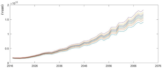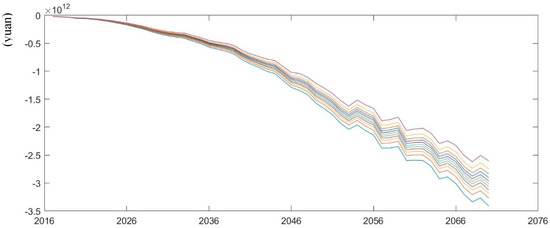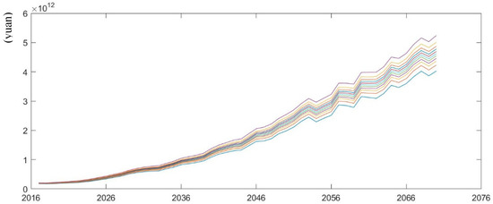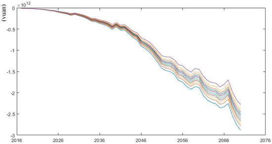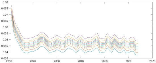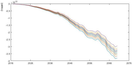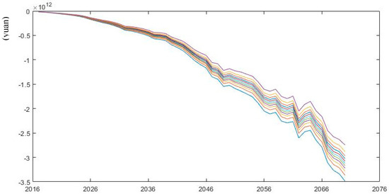 According to the mortality forecasting models in various scenarios of Wang and Ren (2012) by [34], we simulate pension gap under low and high mortality rates from 2017 to 2070. As is shown in Figure 8; Figure 9, future pension gap becomes larger under low mortality rate compared with the scenario of high mortality rate. When the median values of pension gap under various scenarios are extracted, the changes in pension gap over time are easily observed. According to Table 2, in 2050 and 2070, the pension gap under the low mortality rate is projected to increase by 9.74% and 0.79% compared with the baseline scenario, whereas the pension gap under the high mortality rate will decrease by 8.76% and 12.9% respectively compared with the medium mortality rate. This phenomenon can be explained by the fact that longevity prevails, and the number of pensioners increases under the low mortality rate, leading to an increase in pension expenditures without increasing any contributions. Thus, the sustainability of pension fund deteriorates. The situation becomes the opposite under the high mortality rate.