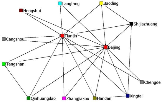 According to the improved gravity model of Formula (1) mentioned above, the carbon emission gravity matrix of the urban agglomeration of Beijing–Tianjin–Hebei is primarily calculated and converted into a spatial correlation matrix. In order to more effectively demonstrate the structure of the spatial correlation network of carbon emissions of the urban agglomeration of Beijing–Tianjin–Hebei, this paper draws a spatial correlation network of carbon emissions in 2016 by using the visualization tool Net-draw from the software UCINET6.0 ( UCINET v6.0, Analytic Technologies, Lexington, KY, USA). The specific results of the network are shown in Figure 1.