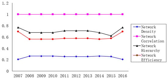 In order to further investigate the spatial network characteristics of carbon emissions in the urban agglomeration of Beijing–Tianjin–Hebei, the network density, network correlation, network hierarchy, network efficiency, point degree centrality, and intermediary centrality were calculated based on Formula (2–7). The spatial network characteristics of carbon emissions of the urban agglomeration of Beijing–Tianjin–Hebei from 2007 to 2016 were analyzed from two aspects: The entire network’s characteristics and individual centrality. Firstly, the overall characteristics of the spatial network of carbon emissions in the urban agglomeration of Beijing–Tianjin–Hebei were calculated; the specific results are shown in Figure 2.