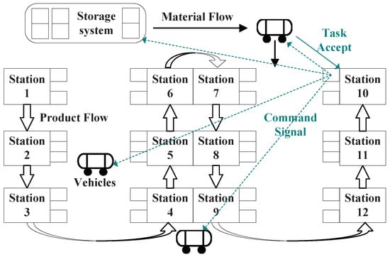 The material handling system (MHS), a vital part of the manufacturing plant, faces more complicated and uncertain disturbances in intelligent processes. Those unexpected events may lead to production delays or even breakdowns, as well as economic losses. Pioneers have tried to provide more sustainable MHSs that are resilient to these disturbances and can reduce resource waste. Here, resilience is the ability of the system to absorb the effects of a disturbance and quickly return to the normal operational state. In general, MHSs help promote sustainable manufacturing in two ways. On the one hand, as a “bridge” between one production line and the next, MHSs integrate all sustainable manufacturing processes within the factory as a whole. Rajesh [3] illustrated that increasing the resilience of each manufacturing process in a factory or a supply chain can reduce the disruption probability and enhance the resilience and sustainability of the whole system. On the other hand, studying MHSs’ response to a disturbance, i.e., resilience issues, helps improve the efficiency of the entire manufacturing system by preventing overtime work and additional resource consumption. A sustainable system should be resilient. Pope et al. [4] referred to enhancing resilience as one of the four discourses of “sustainable development” and “sustainability assessment”. Jayal et al. [5] claimed that sustainable manufacturing differentiates itself from other concepts (e.g., green manufacturing) partly for its notion of recovery ability. Of course, a resilient system is more sustainable. It is not only able to withstand the disturbances caused by the external environment but also able to reduce the waste of production resources through adaptation and recovery. For example, Nakano [6] proposed a “Vee” model to test the disruption and resilience of the system, aiming to realize sustainable manufacturing. Through a detailed, triangulated secondary data analysis and industry survey, Thomas et al. [7] summarized the tools, methods, and models that UK manufacturing companies adopted and applied in order to achieve resiliency and economic sustainability. The result showed that companies with better sustainability and resilience developed and applied more resiliency and sustainability models. Hence, in this paper, we focus on the resilience of the MHS and how it benefits sustainable manufacturing.